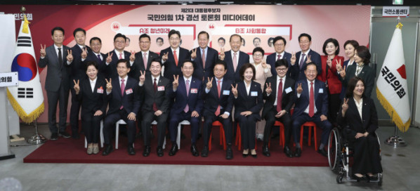 ▲제21대 대통령후보자 국민의힘 1차 경선 토론회 미디어데이가 17일 오전 서울 영등포구 여의도 중앙당사에서 열렸다. 경선 후보자들이 피켓을 들고 기념촬영을 하고 있다. 앞줄 왼쪽부터 홍준표 전 대구시장, 유정복 인천시장, 이철우 경북도지사, 김문수 전 고용노동부 장관. 뒷줄 왼쪽부터 양향자 전 의원, 안철수 의원, 나경원 의원, 한동훈 전 대표. 신태현 기자 holjjak@