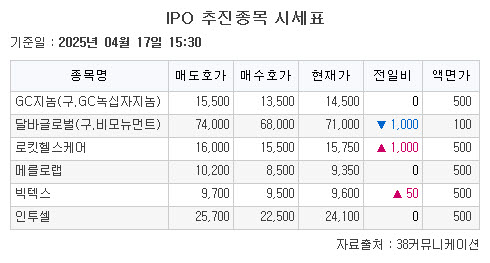 사물인터넷 플랫폼 전문업체 메를로랩은 호가 변화가 없었다. 상장 예비심사 승인 종목인 인공지능(AI) 기반 장기재생 전문기업 로킷헬스케어는 6.78% 오른 1만5750원을 기록했다.