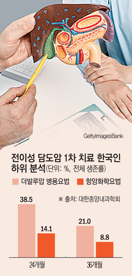 한국인 환자만을 대상으로 한 하위 분석 결과는 더욱 고무적이다. 기존 치료에서 24개월 시점에 14.1%, 36개월 시점에 8.8%에 불과했던 전체생존율이 면역항암제를 쓰면 38.5%, 21.0%로 대폭 증가했다. 담도암이란 불모지에도 장기 생존의 희망이 생긴 셈이다.