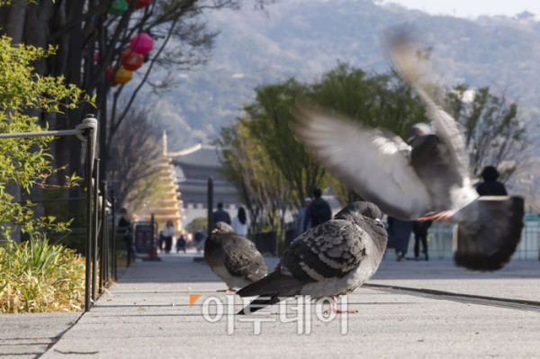 ▲7월부터 서울 광화문광장, 한강공원 등지에서 비둘기, 까치 등 유해야생동물에 먹이를 주다가 적발되면 최대 100만 원의 과태료가 부과된다. 서울시는 시내 도시공원 등 38곳을 유해야생동물 먹이주기 금지구역으로 지정해 10일 고시했다. 유해야생물은 비둘기, 참새, 까치, 까마귀, 꿩, 고라니 등이다. 단속에 적발되면 1회 20만 원, 2회 50만 원, 3회 이상 100만 원의 과태료 처분을 받는다. 광화문광장에서 비둘기들이 먹이를 찾고 있다. 조현호 기자 hyunho@
