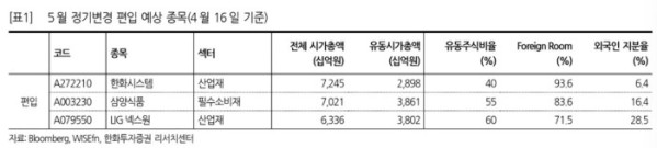 한편, MSCI 편출입 종목은 다음 달 14일 발표되고, 지수 리밸런싱은 5월 30일 종가 기준으로 진행된다.