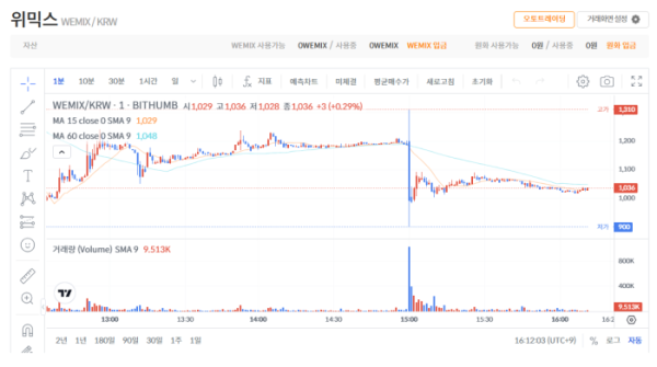 거래유의종목 지정 연장 발표 직후 위믹스는 빗썸 기준 1200원대에서 900원대까지 급락했다. 이후 낙폭을 일부 회복해 현재 1030원대에서 거래되는 중이다. 유의지정 해제를 기대했던 투자자들의 실망감이 반영된 것으로 풀이된다.