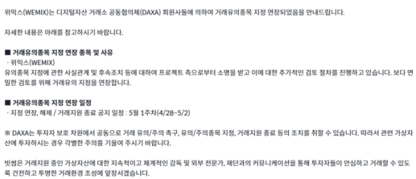 위믹스의 거래유의종목 지정이 2주간 더 연장됐다. 거래소들은 추가 검토 필요성을 연장 이유로 밝혔다. 위믹스에 대한 처분은 5월 1주차(4월 28일~5월 2일)에 결정된다.