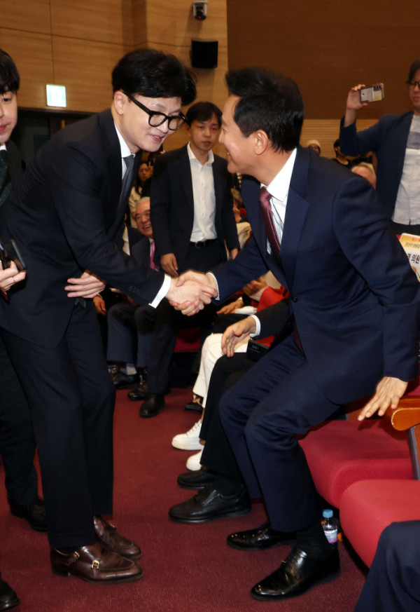 ▲한동훈 국민의힘 대표와 오세훈 서울시장이 2024년 9월 24일 오후 서울 여의도 국회 의원회관 대회의실에서 열린 한미동맹 발효 70주년 기념 다큐멘터리: K-A 가디언즈 시사회에서 악수를 하고 있다. (뉴시스)