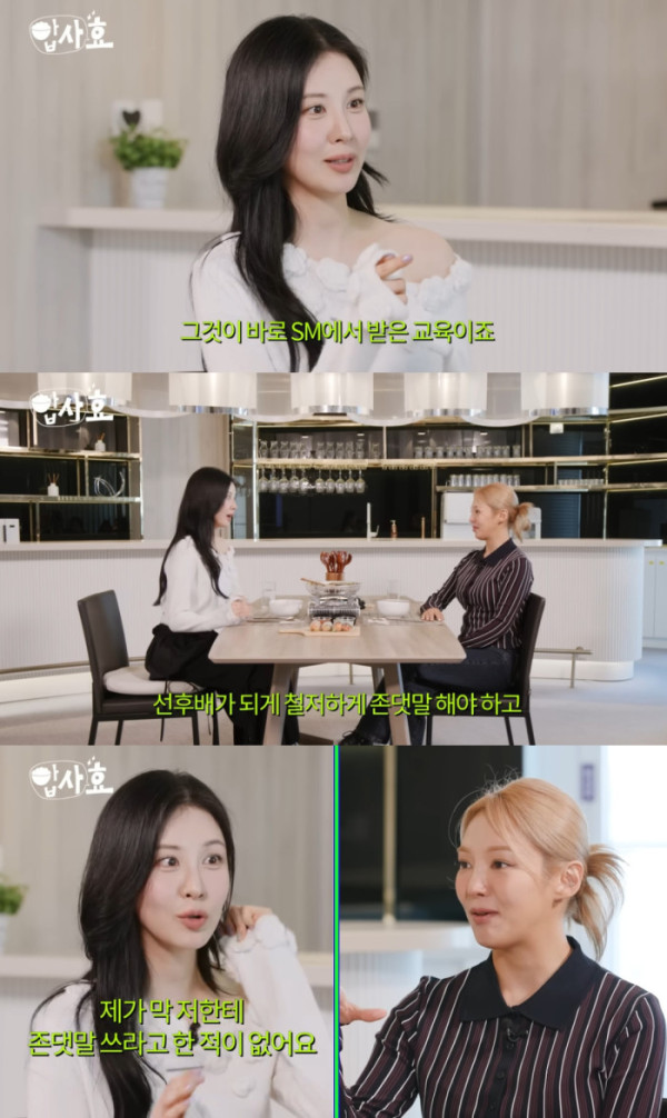 서현은 “우리 초등학교 때 연습생이 됐을 때 선후배가 철저히 존댓말을 해야 하고 그게 예의였다”라며 “들어가서 처음으로 마주친 유리 언니가 ‘반말 안 된다, 존댓말 해야 한다’라고 해서 그때부터 몸에 뱄다”라고 설명했다.