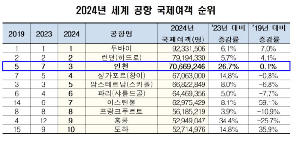인천공항, 개항 이후 첫 국제여객순위 세계 3위 달성