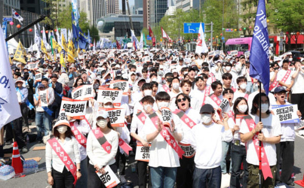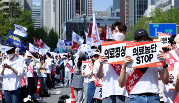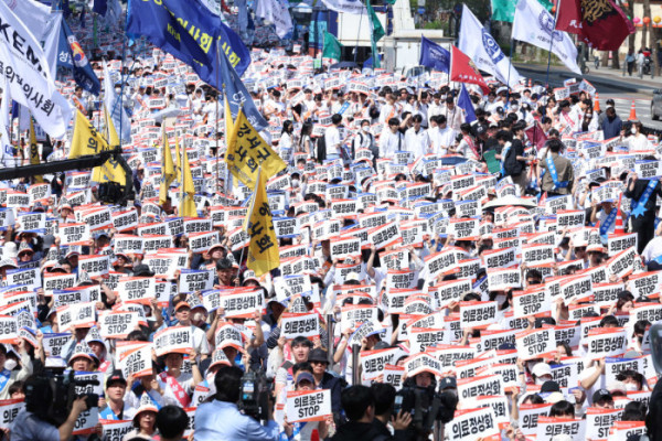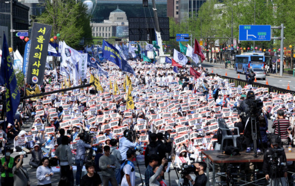 ▲20일 서울 중구 숭례문 인근 세종대로에서 ‘의료정상화를 위한 전국의사궐기대회’가 열리고 있다. 신태현 기자 holjjak@