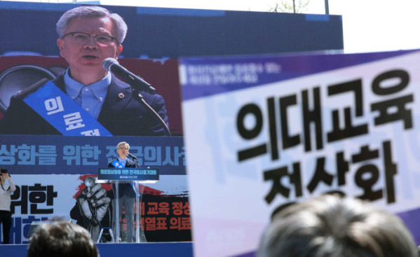 ▲김택우 대한의사협회장이 20일 서울 중구 숭례문 인근 세종대로에서 열린 ‘의료정상화를 위한 전국의사궐기대회’에서 대회사를 하고 있다. 신태현 기자 holjjak@