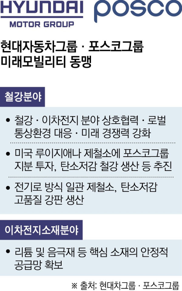 포스코그룹과 현대자동차그룹이 철강ㆍ이차전지 분야 협력을 통해 글로벌 미래 모빌리티 소재 시장 선점에 나선다. 글로벌 경제 블록화 및 급변하는 통상 환경에서 양사의 경쟁력을 바탕으로 시너지를 창출한다는 계획이다.