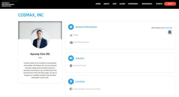 코스맥스는 이달 초 경영 전반에서 성평등과 여성역량강화 증진을 위해 원칙을 이행하겠다는 의지를 표명하는 지지 서명을 제출하며 이니셔티브에 공식 가입했다. 화장품 산업의 특성상 다양성과 관련한 투자자 및 고객사의 관심도가 높은 만큼 체계적인 여성 인재 육성 제도를 운용하고 있다.