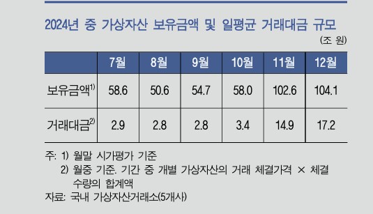 한국은행이 21일 발표한 ‘2024년도 지급결제보고서’를 보면 작년 12월말 기준 국내 가상자산거래소 5개사의 가상자산 보유금액은 104조1000억 원으로 집계됐다. 작년 7월부터 10월까지 50조 원대 수준이었으나 11월에 102조6000억 원으로 급증했다.