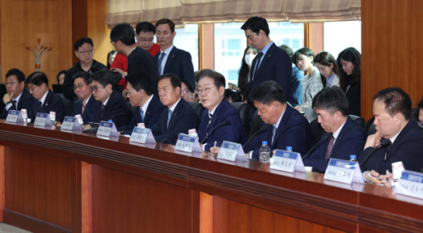 ▲이재명(왼쪽) 더불어민주당 대선 경선 후보와 서유석 금융투자협회 회장이 21일 서울 여의도 금융투자협회에서 열린 ‘자본시장 활성화를 위한 정책간담회’에 참석하고 있다. 신태현 기자 holjjak@
