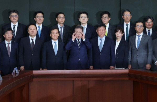 ▲이재명 더불어민주당 대선 경선 후보와 서유석 금융투자협회 회장, 주요 증권사 리서치센터장 등이 21일 서울 여의도 금융투자협회에서 열린 ‘자본시장 활성화를 위한 정책간담회’에 앞서 기념촬영을 하고있다. 신태현 기자 holjjak@