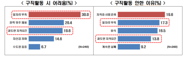 이어 △경력직 위주의 채용 구조(20.4%) △과도한 자격요건 및 스펙 요구(19.6%) △지속적 실패로 인한 자신감 저하 및 구직의욕 감소(14.6%) △일자리의 수도권 집중(6.7%)순이었다.