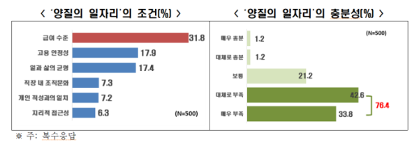 ‘양질의 일자리’가 한국 사회에 충분히 존재하는 지에 대해 묻는 질문에서는 10명 중 8명(76.4%은 ‘부족하다’고 답했다.