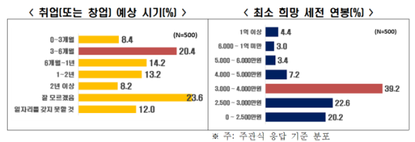 구직활동 중인 미취업 청년 2명 중 1명(50.4%)은 ‘양질의 일자리 부족’과 ‘경력 위주 채용’을 가장 큰 구직의 어려움으로 꼽았다. 이들이 희망하는 최소한의 세전 연봉 수준은 평균 3468만 원이었다.