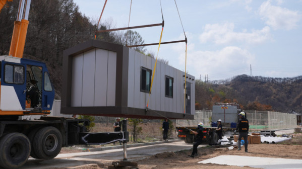 ▲경북 영양 지역에 대형 산불 피해 이재민을 위한 희망하우스가 크레인으로 설치되고 있다. (사진제공=손해보험 사회공헌협의회)