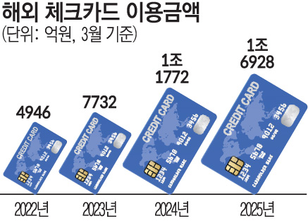 해외 체크카드 이용금액은 2022년 1분기 4946억 원, 2023년 7732억 원 등 지속해서 높은 증가세를 보이고 있다. 반면 같은 기간 해외 신용카드 이용액은 2022년 1조7284억 원에서 코로나19 팬데믹 종결 효과로 2023년 3조189억 원으로 급증한 뒤 제자리걸음이다.
