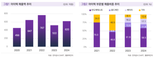 이충헌 밸류파인더 연구원은 "최근 국내 증시에서는 퓨리오사AI 등 반도체 팹리스 기업에 대한 관심이 고조되고 있는데, 아이텍은 현재 특정 고객사에 치우치지 않고 넥스트칩, 텔레칩스, 에이디테크놀로지, LG전자 등의 팹리스 및 디자인하우스 등 170여 개의 고객사를 확보하고 있다"라며 "동사가 국내에서 가장 많은 어드반테스트 장비를 보유하고 있는 덕분이며, 오랜 경력을 가진 연구개발(R&D) 인력을 28명 보유하고 있어 연간 100개가 넘는 반도체 테스트 프로그램을 개발하고 있으므로 가능한 것으로 보인다"라고 밝혔다.
