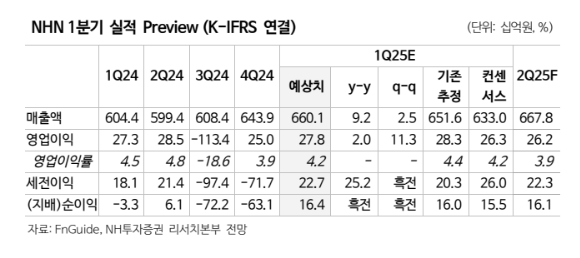 안재민 NH투자증권 연구원은 “NHN의 올해 1분기 매출은 전년 대비 9.2% 증가한 6601억 원, 영업이익은 2.0% 늘어난 278억 원으로 영업이익 기준 시장 컨센서스 263 억원을 충족할 전망”이라고 밝혔다.