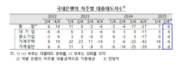 대출태도지수에서 ‘+’ 부호는 대출태도 완화, 신용위험 증가 및 대출수요 증가를 의미한다. ‘-’ 부호는 그 반대로 해석한다.