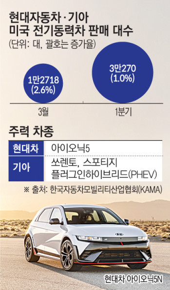 22일 한국자동차모빌리티산업협회(KAMA)가 발표한 ‘3월 미국 전기동력차 판매 동향’에 따르면 현대차·기아의 지난달 미국 내 전기차 판매량은 전년 동월 대비 2.6% 증가한 1만2718대를 기록했다. 올해 1분기 누적 판매는 전년 같은 기간보다 1.0% 늘어난 3만270대로 집계됐다.