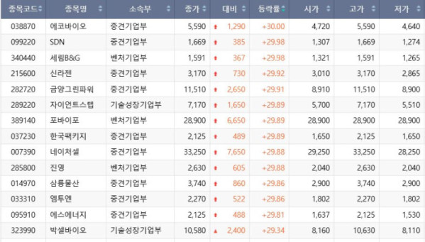 같은 날 코스닥 시장에서 상한가를 기록한 종목은 에코바이오, SDN, 세림B&G, 신라젠, 금양그린파워, 자이언트스텝, 포바이포, 한국팩키지, 네이처셀, 진영, 삼륭물산, 엠투엔, 에스에너지, 박셀바이오 등 14종목이다. 하한가를 기록한 종목은 없었다.