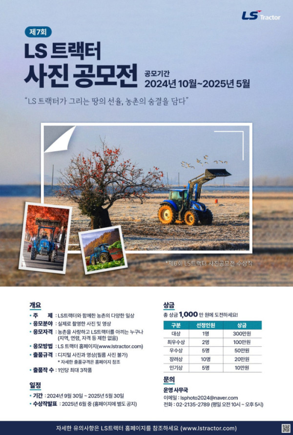 이번 공모전은 ‘LS트랙터와 함께한 농촌의 다양한 일상’이라는 주제로 농촌의 사계절과 자연, 사람, LS트랙터가 조화를 이뤄 농촌의 생동감과 진정성이 잘 드러나는 작품을 선정해 시상할 예정이다.