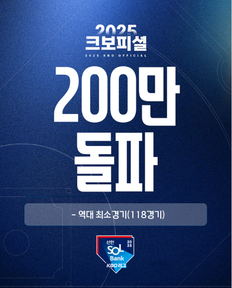 한국야구위원회(KBO)는 22일 '2025 신한 SOL뱅크 KBO리그'가 잠실·수원·고척 구장 경기에서 총 2만5247명이 입장하며 200만 관중을 달성했다고 밝혔다.