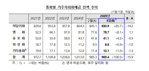 한국은행이 23일 발표한 ‘2025년 3월중 거주자외화예금 동향’에 따르면 지난달 외국환은행의 개인예금은 전월보다 3억5680만 달러 감소한 135억5000만 달러로 집계됐다. 2019년 4월 30일 132억4000만 달러 이후 5년 11개월 만에 최저치다.