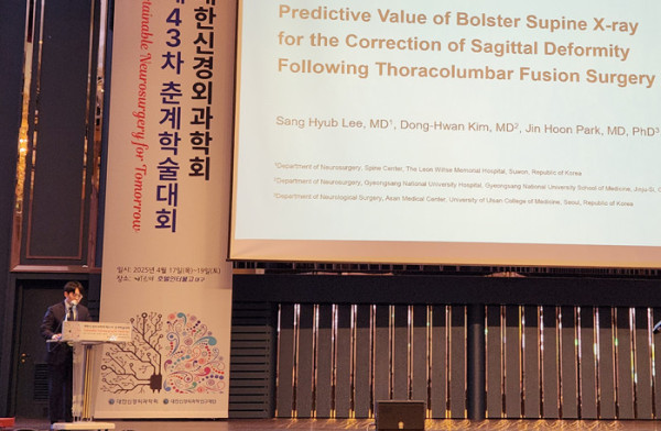 ▲이상협 과장이 대한신경외과학회 제43차 춘계학술대회에서 "Predictive Value of Bolster Supine X-ray for the Correction of Sagittal Deformity Following Thoracolumbar Fusion Surgery"를 주제로 발표하고 있다. (윌스기념병원)
