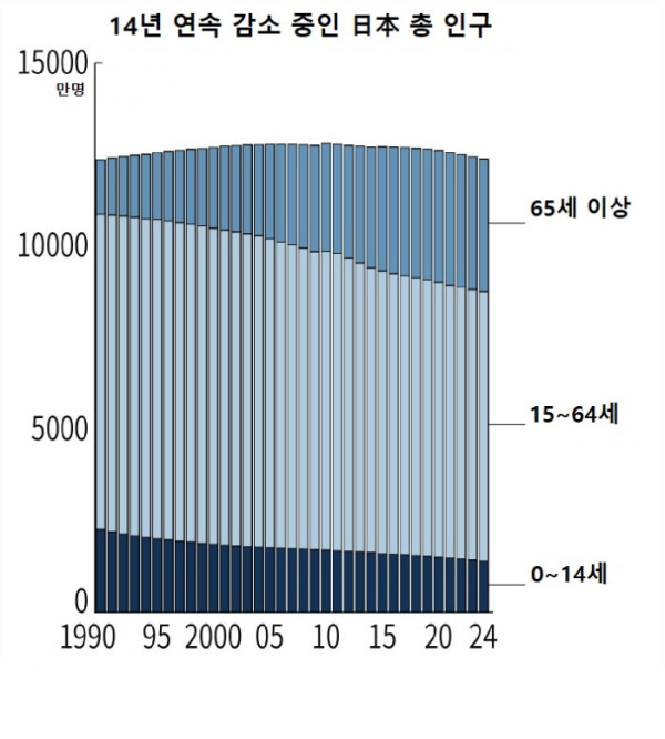 일본 총무성이 밝힌 2024년 총인구는 약 1억2380만 명. 전년 대비 약 55만 명이 줄어든 것으로 14년 연속 감소세다. 2015년 이후 감소세와 감소 폭은 유사한 형태로 이어지고 있다. 해마다 경기도 안양시 인구(약 56만 명)만큼 총인구가 증발하는 셈이다.