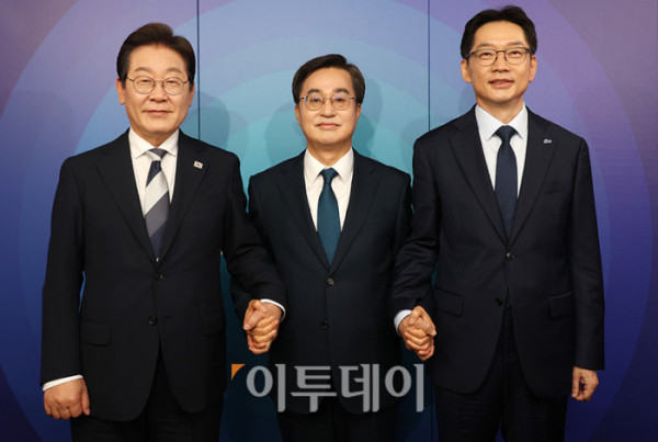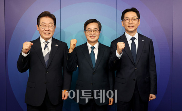 더불어민주당 제21대 대통령선거 경선에 나선 이재명, 김동연, 김경수 예비후보가 23일 서울 여의도 오마이TV 스튜디오에서 열린 토론회에서 기념촬영을 하고 있다. 국회사진취재단
