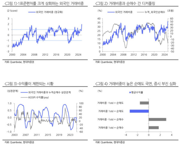 이어 "외국인의 거래비중이 높아지는 현상은 증시에는 대체로 긍정적이지만, 문제는 외국인 수급의 방향성이 매도로 향해 있다는 점"이라고 강조했다.