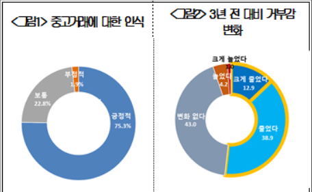 24일 대한상공회의소는 ‘중고제품 이용 실태조사 및 순환유통 비즈니스모델 혁신 보고서'를 발표했다. 최근 1년 내 중고 거래 경험이 있는 전국 20~50대 소비자 1000명을 대상으로 실시한 조사 결과에 따르면 응답자의 75.3%가 중고제품 거래에 대해 ‘긍정적’이라 답했다. ‘부정적’이라고 답한 비율은 1.9%에 불과했다.