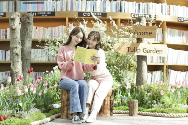 ▲스타필드 코엑스몰 별마당 도서관 ‘별마당 튤립 정원’에서 모델들이 시집을 감상하고 있다. (사진제공=신세계프라퍼티)