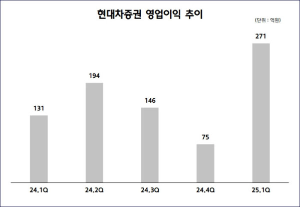 현대차증권은 연결 기준 올해 1분기 영업이익이 271억 원으로 지난해 동기(131억 원) 대비 106.2% 증가했다고 24일 밝혔다.