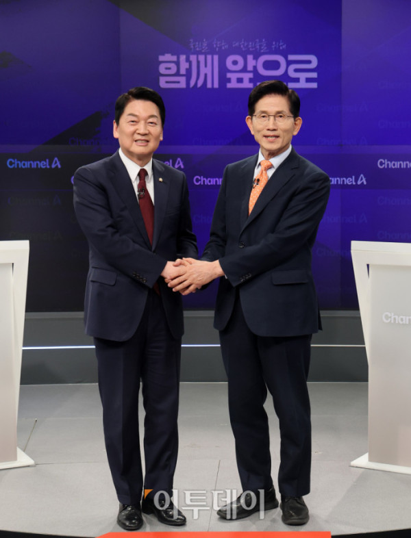 ▲24일 오후 종로 동아미디어센터 채널A 스튜디오에서 국민의힘 대선 2차 경선 진출자인 안철수 김문수 후보가 토론 전 악수를 하고 있다. 일대일 맞수 토론은 2차경선 진출자 4명이 일대일 맞수 토론 형식으로 내일까지 진행된다. 대진표는 전날 '미디어데이' 행사에서 김문수·안철수·한동훈·홍준표 후보가 순서대로 일대일 토론 상대를 지목했다. 김 후보가 한 후보를, 안 후보가 김 후보를 골라 토론이 성사됐다. 한 후보와 홍 후보는 서로 지목했다. (국회사진취재단 )