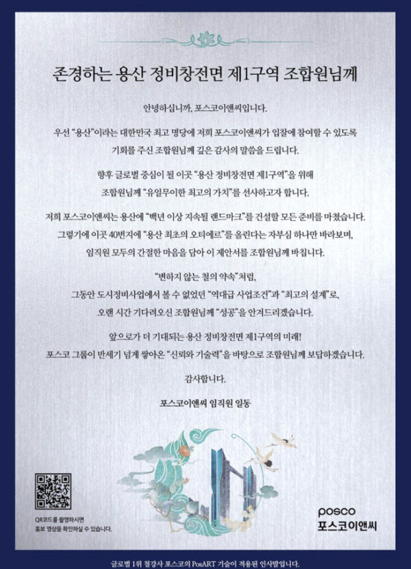 포스코이앤씨는 25일 조합원에게 보내는 인사말을 통해 “대한민국 최고의 명당인 용산에 입찰할 기회를 주신 데 깊이 감사드린다”며 “용산에 백 년 이상 지속될 랜드마크를 건설할 모든 준비를 마쳤다”고 했다.