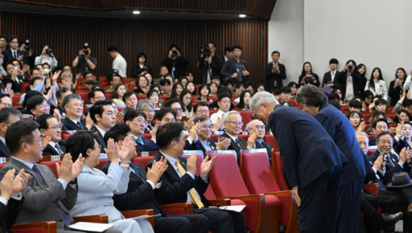 ▲문재인 전 대통령과 김정숙 여사가 25일 서울 여의도 국회도서관에서 열린 4.27 판문점선언 7주년 기념식에 참석해 박수를 치고 있다. 신태현 기자 holjjak@