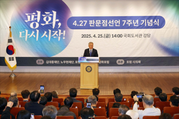 ▲문재인 전 대통령이 25일 오후 서울 여의도 국회 도서관 대강당에서 열린 '평화, 다시 시작!' 4.27 판문점선언 7주년 기념식에서 기념사를 하고 있다. 신태현 기자 holjjak@