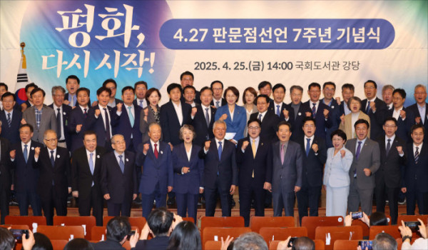 ▲문재인 전 대통령과 김정숙 여사, 우원식 국회의장, 박찬대 더불어민주당 당대표 직무대행 겸 원내대표 등 이 25일 오후 서울 여의도 국회 도서관 대강당에서 열린 '평화, 다시 시작!' 4.27 판문점선언 7주년 기념식에서 기념촬영을 하고 있다. 신태현 기자 holjjak@