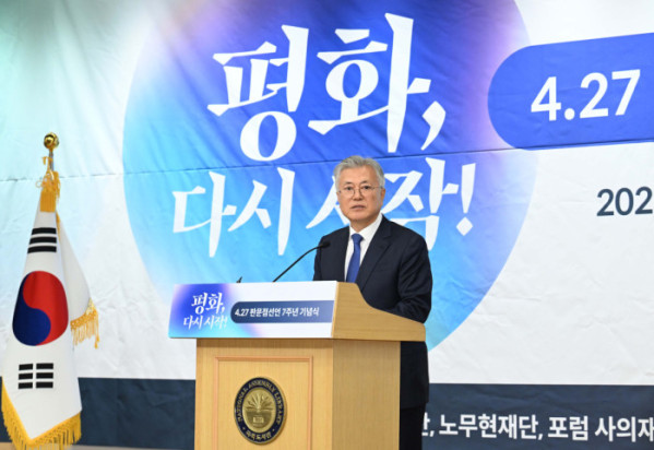 ▲문재인 전 대통령이 25일 서울 여의도 국회도서관에서 열린 4.27 판문점선언 7주년 기념식에 참석해 기념사를 하고 있다. 신태현 기자 holjjak@