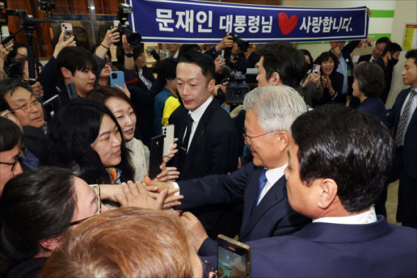 ▲문재인 전 대통령이 25일 오후 서울 여의도 국회 도서관 대강당에서 열린 '평화, 다시 시작!' 4.27 판문점선언 7주년 기념식 참석을 마친 뒤 지지자들과 인사를 나누고 있다. 신태현 기자 holjjak@