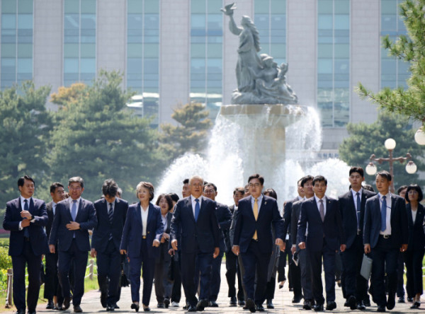 ▲문재인 전 대통령과 김정숙 여사, 우원식 국회의장 등이 25일 서울 여의도 국회 도서관에서 열린 4·27 남북 판문점선언 7주년 기념식에 참석하기 위해 본청에서 이동하고 있다. 신태현 기자 holjjak@