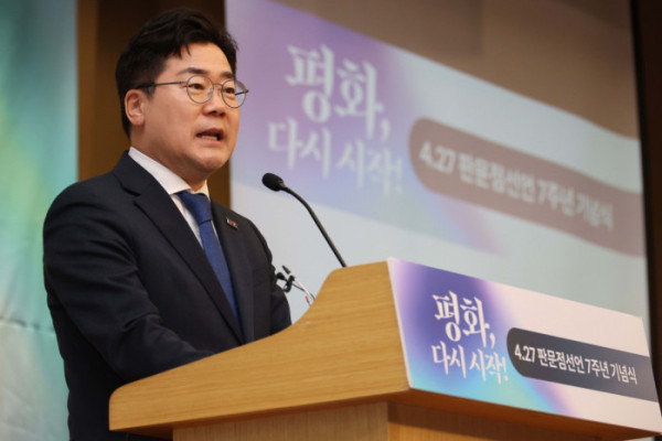 ▲더불어민주당 당대표 직무대행 겸 원내대표가 25일 서울 여의도 국회도서관에서 열린 4.27 판문점선언 7주년 기념식에서 축사를 하고 있다. 신태현 기자 holjjak@