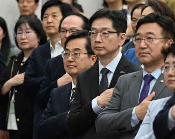 ▲더불어민주당 대선 경선 후보 김동연과 김경수가 25일 서울 여의도 국회도서관에서 열린 4.27 판문점선언 7주년 기념식에 참석해 국민의례를 하고 있다. 신태현 기자 holjjak@