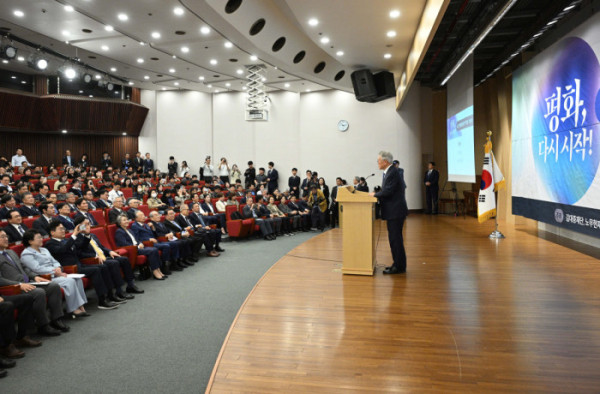 ▲우원식 국회의장이 25일 서울 여의도 국회도서관에서 열린 4.27 판문점선언 7주년 기념식에서 축사를 하고 있다. 신태현 기자 holjjak@