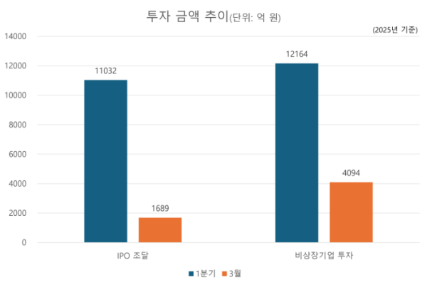 반면, 비상장기업 투자는 올해 내내 부진을 면하지 못했다. 유진투자증권이 인용한 혁신의 숲 자료에 따르면 올해 3월 비상장기업의 투자 유치 금액은 4094억 원 수준으로, 지난해 동월보다 낮았다. 1분기 총투자금액 또한 1조2164억 원가량으로 추산되며 지난해 동기 2조6100억 원 대비 절반 넘게 감소했다.
