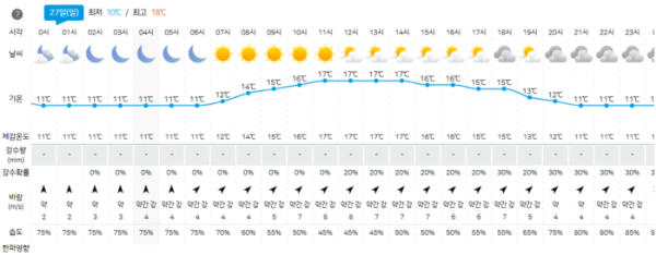 일요일인 27일은 내륙을 중심으로 낮과 밤의 기온 차가 15도 내외로 커 옷차림에 유의가 필요하겠다.